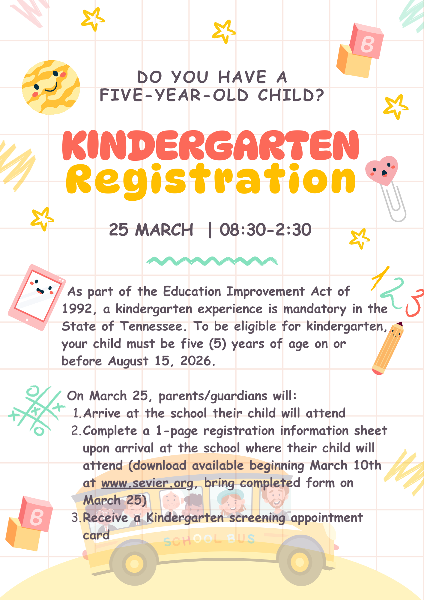 Kindergarten Registration for the 2026 & 2027 School Year March 25, 2026 8:30 a.m. - 2:30 p.m. Sevier County Schools will hold Kindergarten registration for the 2026-2027 school year on March 2...